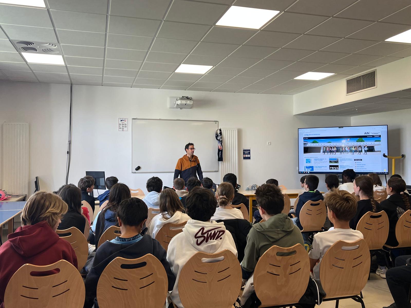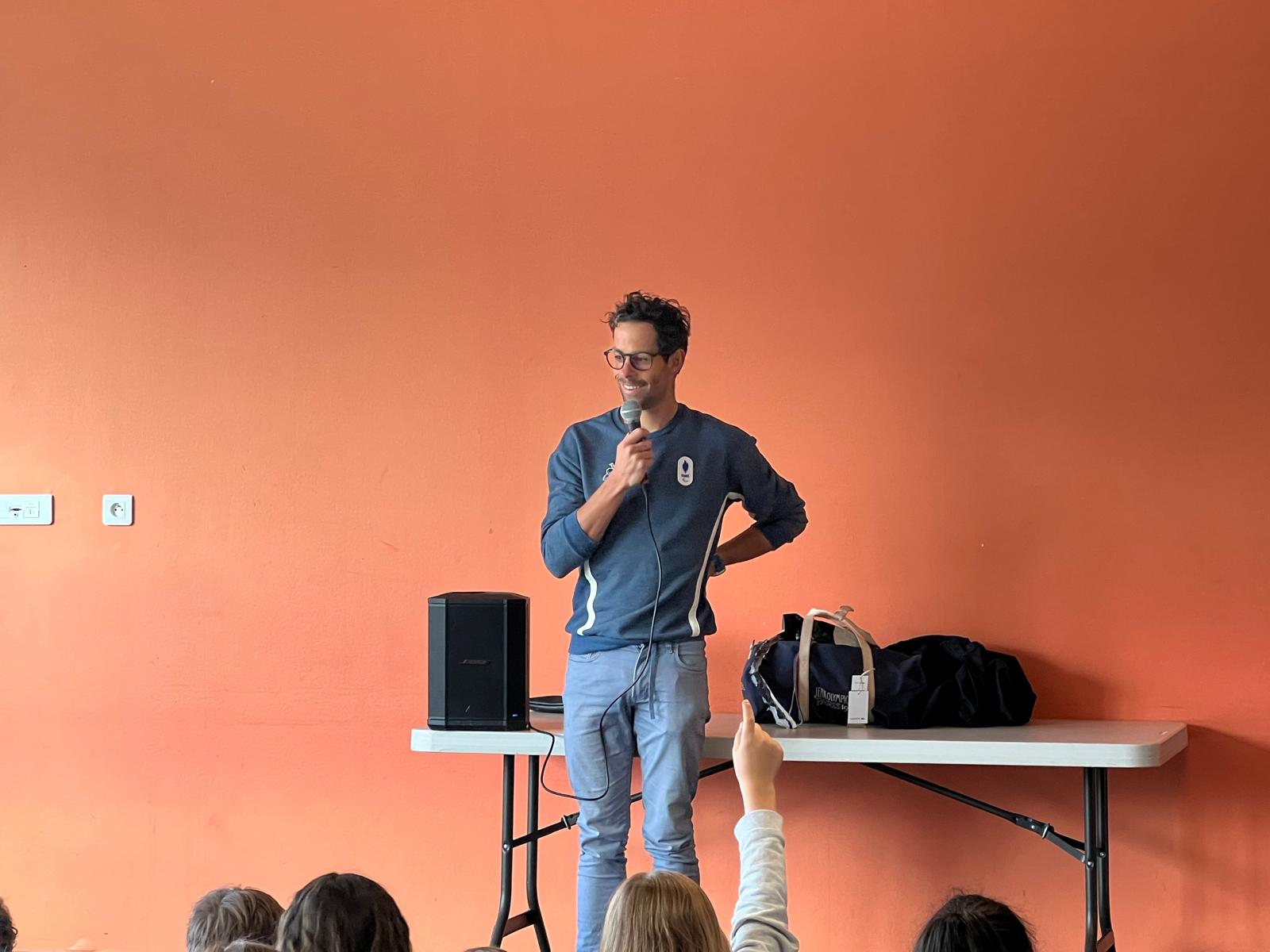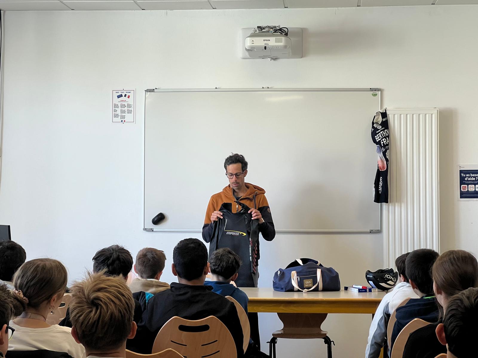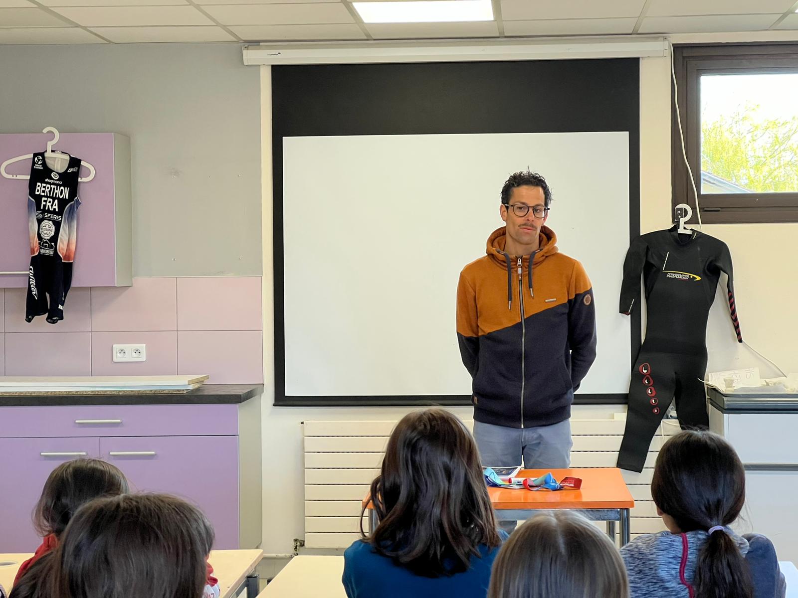 Les élèves ont également pu échanger avec Grégoire Berthon, paratriathlète, autour du handicap et du sport pour tous, en présence de Dominique Morand, adjoint en charge de l’éducation, de l’enfance et de la politique familiale.